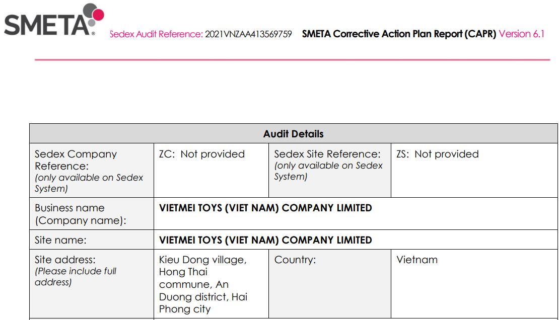 越美玩具(越南)有限公司【VIETMEI TOYS (VIET NAM) COMPANY LIMITED】在創(chuàng)思維技術(shù)服務(wù)(越南)有限公司輔導(dǎo)中2021年順利通過ITS突擊審核的Sedex 4P驗廠,創(chuàng)思維2020年還幫助貴司順利通過ICTI驗廠。
